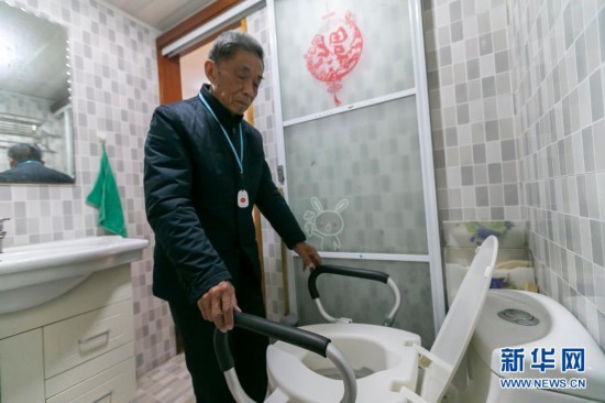 3月12日,爱博一村91岁老人陆生余在家中展示适老化改造后的厕所。