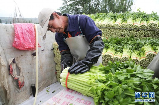 7月27日,甘肃省定西市安定区凤翔镇中川村村民将芹菜装车。新华社发(王克贤 摄)