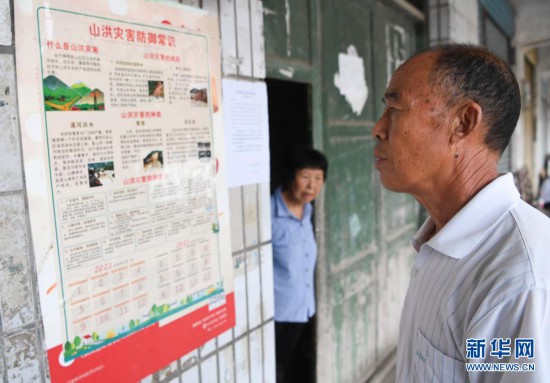 8月8日,重庆市开州区岳溪镇胡家村村民在查看山洪灾害防御常识。