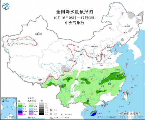全国降水量预报图(10月16日08时-17日08时)