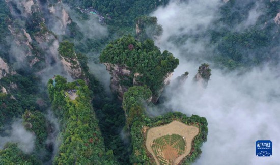 当日,雨后的湖南张家界武陵源,云雾飘荡在峰林之间,若隐若现,美不胜收(无人机照片)。新华社发(吴勇兵 摄)