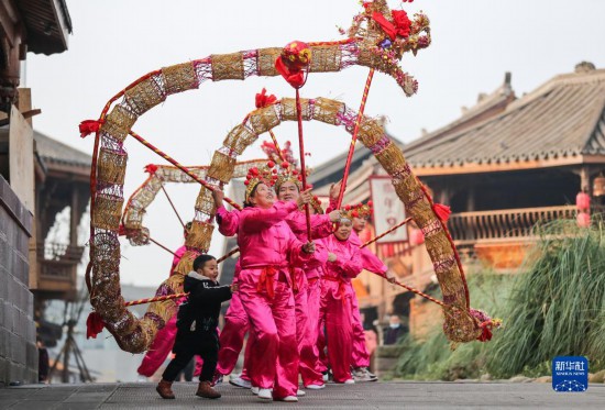 2月13日,在四川省宜宾市翠屏区李庄镇羊街,队员在表演省级非物质文化遗产——李庄草龙舞。