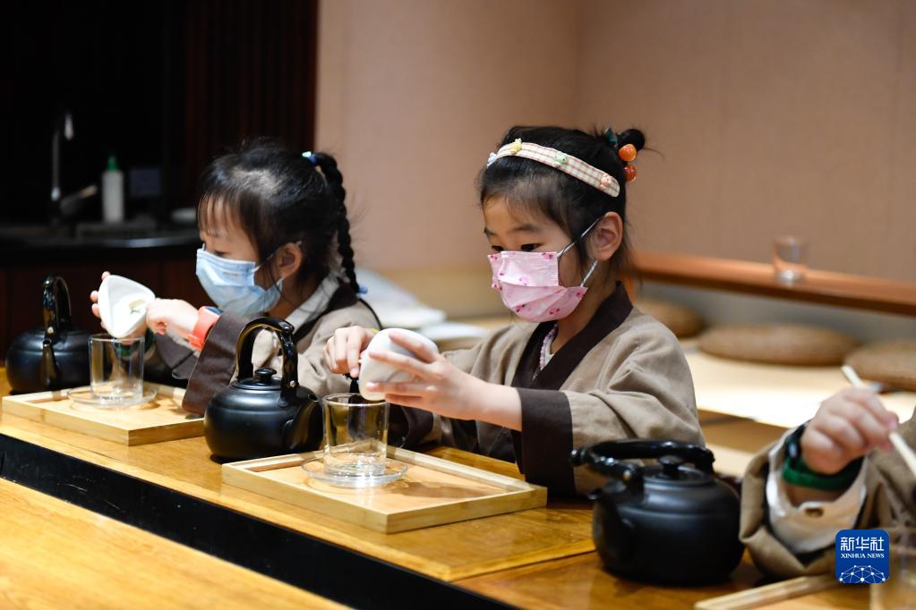 6月5日,小朋友在杭州市青少年活动中心体验做“茶艺师”。