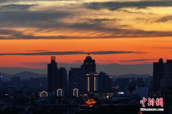 7月7日傍晚,南京上空漫天红霞。近日,当地持续高温,同时“蒸”出晴好天气。(无人机照片)