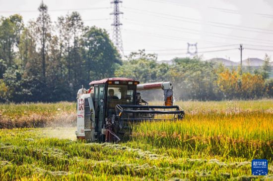 10月25日,收割机在东林镇保国村的稻田里作业。