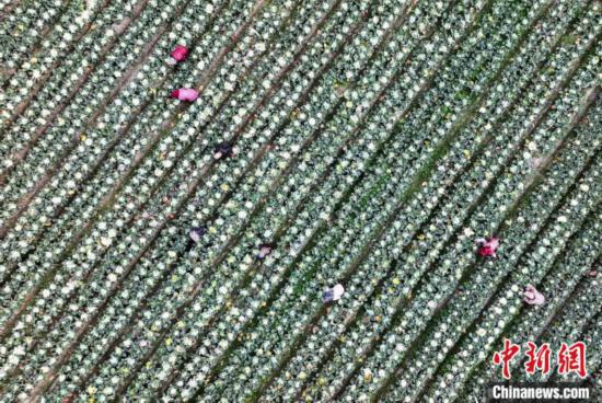 2月24日,工作人员在田间对种植的花菜进行管护。 (无人机照片)中新社记者 张斌 摄