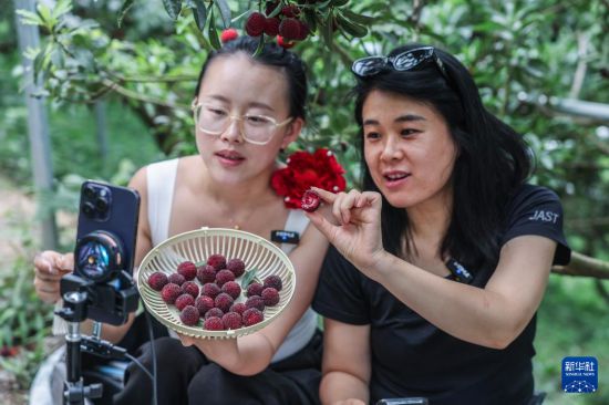 6月4日,在慈溪市匡堰镇杨梅果园大棚内,主播在杨梅树下直播销售杨梅。