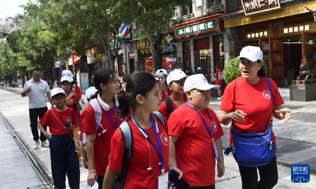 8月3日,来自新疆喀什和夏阿瓦提镇的中小学生在北京前门大街参观研学。