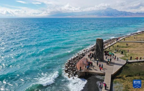 9月11日,游客在赛里木湖景区游览(无人机照片)。