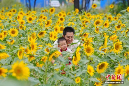 9月21日,北京凉水河公园向日葵花海进入盛花期,金黄的花盘向阳而生,吸引众多游客前来观赏拍照。图为家长与孩子在向日葵花海中自拍留念。
