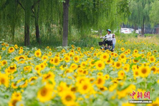 9月21日,北京凉水河公园向日葵花海进入盛花期,金黄的花盘向阳而生,吸引众多游客前来观赏拍照。图为游客骑车观赏向日葵。