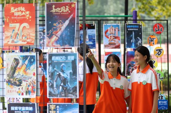 9月26日,在山东省高密市知行学校,中学生参观国庆主题AI海报展。