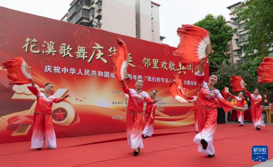 9月26日,在重庆巴南区花溪街道先锋新村小区,社区舞蹈演员表演舞蹈《五星红旗》。
