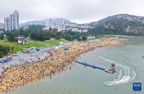 10月5日,游客在江苏连云港市在海一方公园游玩观景(无人机照片)。