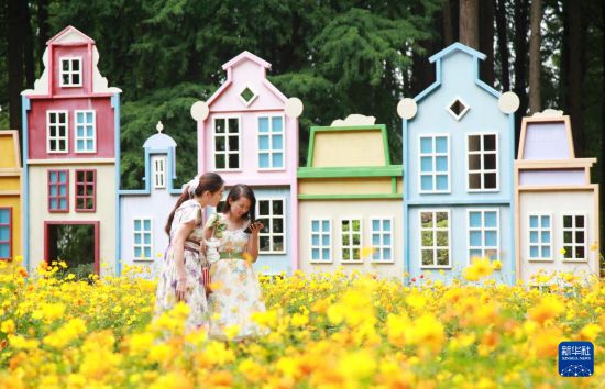 10月5日,人们在南京中山植物园盛开的黄秋英花丛中赏花游玩。