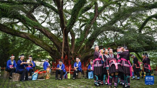 10月17日,侗族群众聚集在良口乡产口村的古榕树下,为展演做准备。