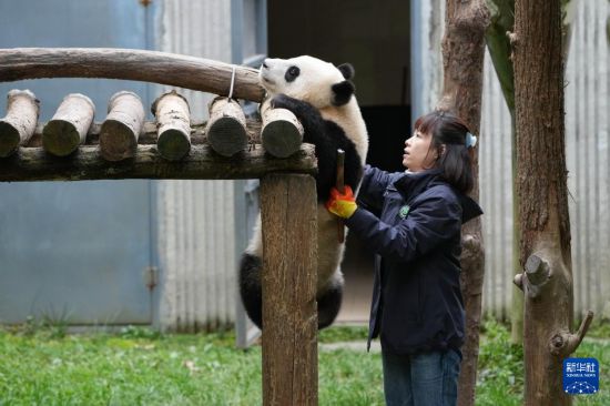 11月6日,在中国大熊猫保护研究中心神树坪基地,饲养员辅助大熊猫练习攀爬。