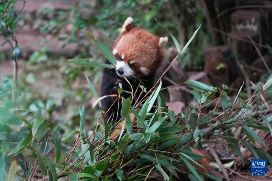 10月30日,在成都大熊猫繁育研究基地,一只小熊猫在吃竹叶。