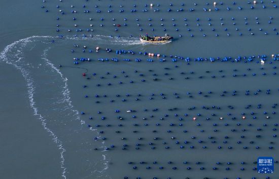 一艘渔船在福建省连江县黄岐半岛海域海上养殖区航行(12月6日摄,无人机照片)。