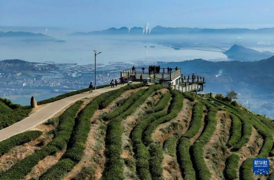 游客在位于福州市连江县炉峰山上的观景平台观赏山海风景(12月6日摄,无人机照片)。