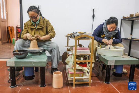 12月24日,侯梦露(右)在位于匡堰镇倡隆村的楝树下艺术村落的东岙窑陶瓷艺术工作室内进行青瓷制作流程中的修坯,鲍祁茗在拉坯。侯梦露是来自广东的“90后”越窑青瓷艺术工作者,目前与同伴鲍祁茗在楝树下艺术村落共同经营东岙窑陶瓷艺术工作室,专注于青瓷的创作与创新。
