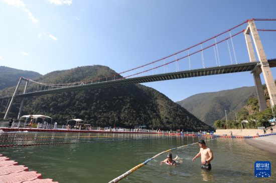 冬日,云南省大理白族自治州南涧彝族自治县公郎镇的澜沧江猛龙渡依旧热闹,游客在碧水青山间游泳、划桨板、骑摩托艇,享受“玩水”乐趣。