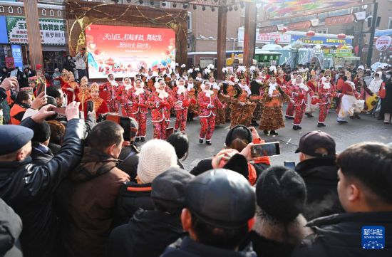 2026年1月1日,社火队员在乌鲁木齐大巴扎步行街表演。