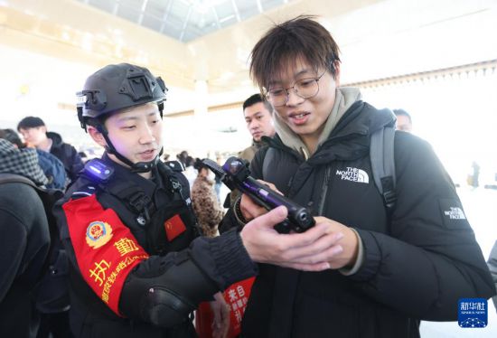 1月9日,在南京南站候车大厅,旅客近距离感受警用装备。