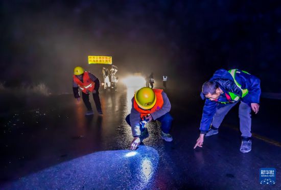 1月22日,养护工人在贵州省黔西市境内211省道黔西至大井段查看道路凝冻情况。