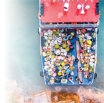 船长秦大益早早上了船。他没有走进那艘红白相间的新船,而是在黄色的老船里停留了很久,里里外外巡视一番,又拿起抹布仔细擦拭条凳。这些条凳陪伴他、他的合伙人曹利芳和菜农们走过了14个春秋。